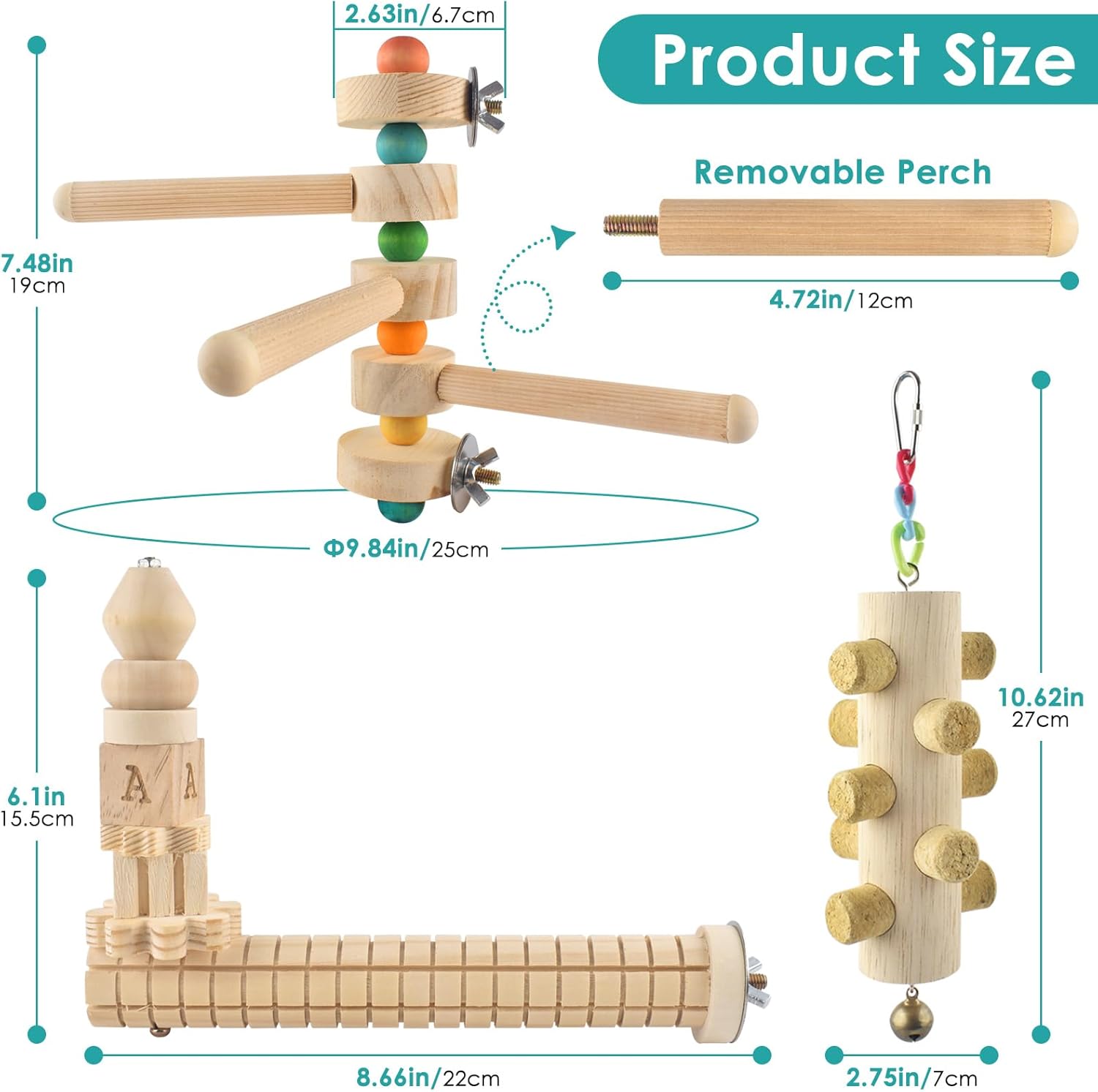 - What You Get: DBNESS bird parrot toy set includes: 1 x L-shaped bird perch with chewing wooden block, 1 x rotating 3-branch parrot perches, 1 x bird hanging removable cork chew toy. Provides a variety of parrot toy types to meet your bird’s daily play needs. (Note: Rotating 3 branches of the parrot perch are removable, please check that they are securely mounted before use)