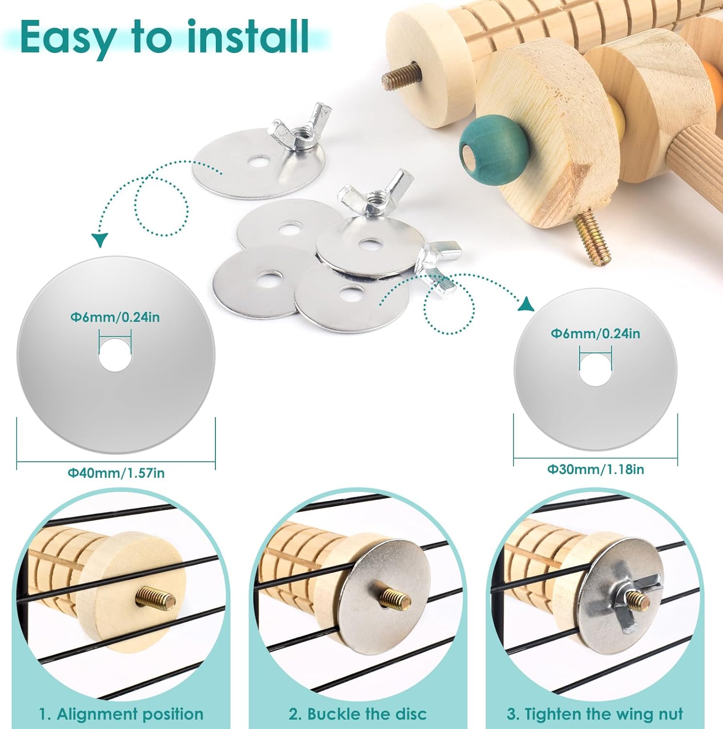 - Easy to Install: L-shaped bird perches for cage and the 3-branch wooden perch stand are equipped with metal wing nuts and built-in bolts, allowing them to be firmly fixed inside or outside the cage without the need for additional installation equipment. The top of the wooden hanging chew toy for parakeet is fitted with a metal hook, enabling it to be easily hung from the cage roof, providing more space for parrots to play and stand
