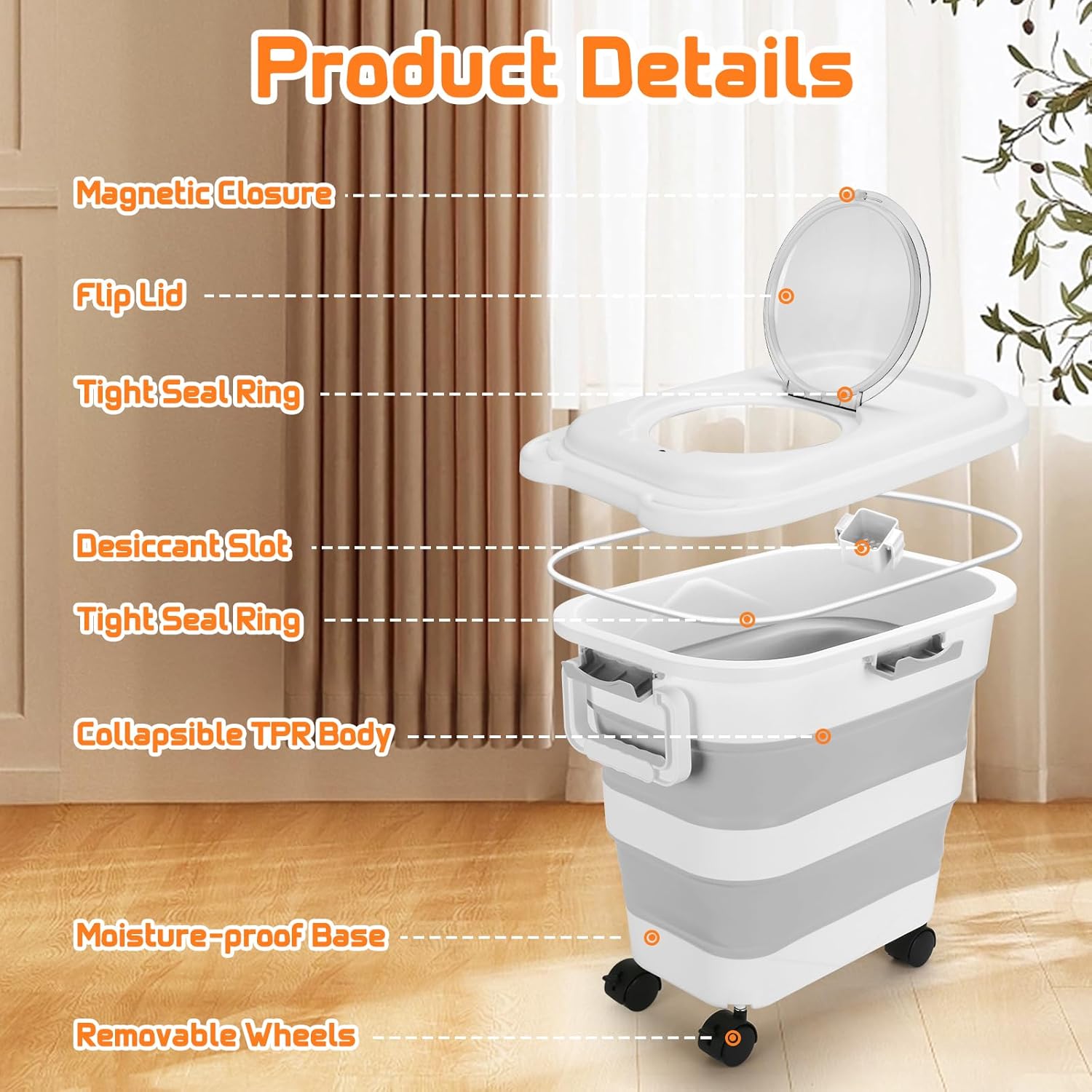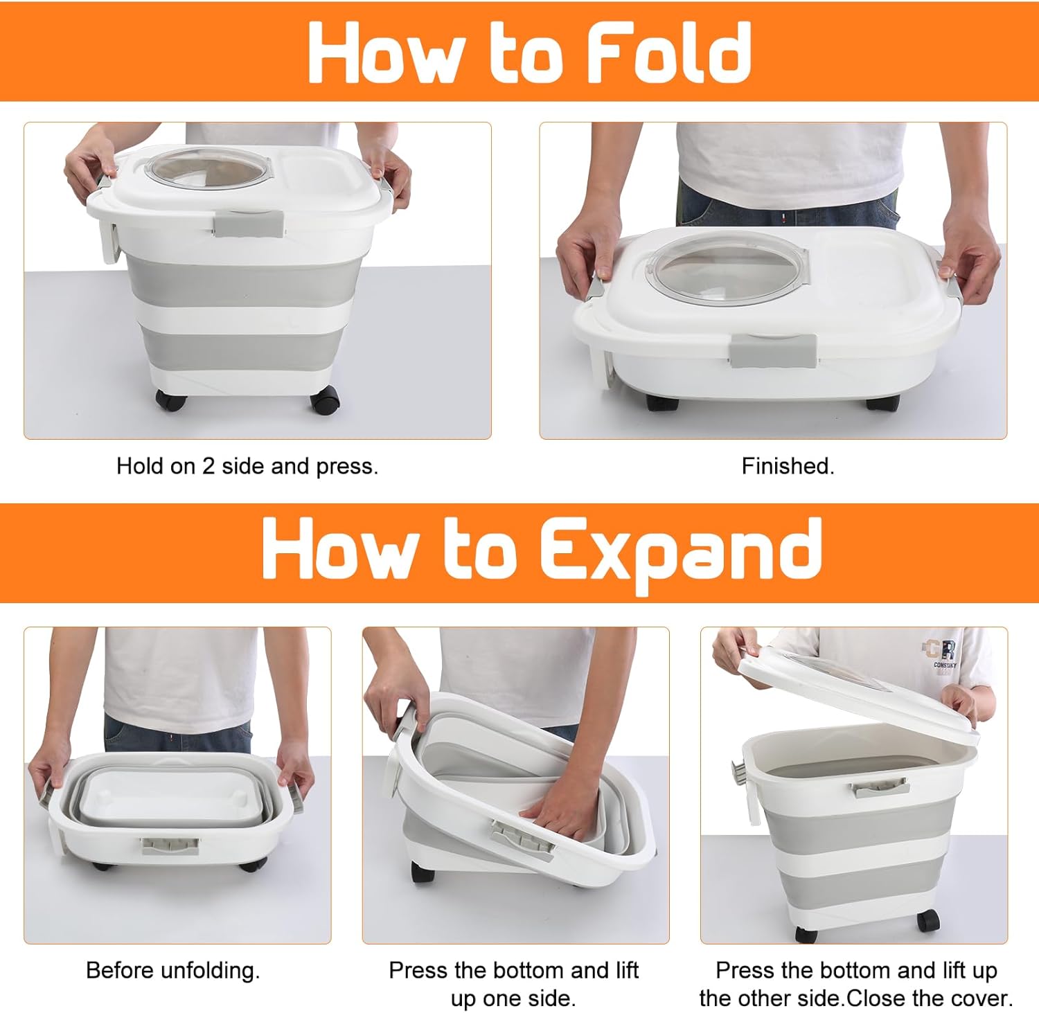 - PREMIUM & HEALTHY: This pet food container is made of high-density polypropylene plastic, which is durable, food grade and environmentally-friendly. The folding part is made of TPR material, which is ductile and can be folded repeatedly. Perfect for storing dog food, rice or other kitchen cereals.