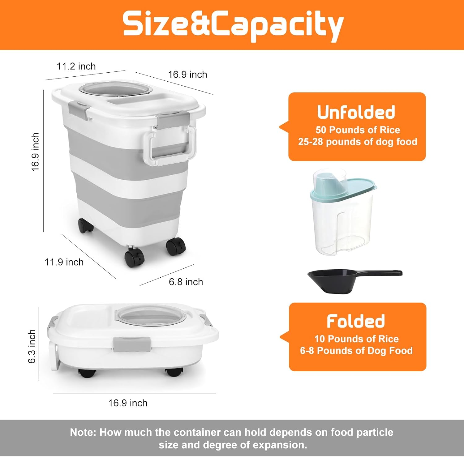 - COLLAPSIBLE & SPACE-SAVING : Our dog food container with wheels is foldable, making it easy to store on a shelf or under cabinets, it is able to be fold saving precious space in your home. Holds up to 25-28 lbs dog food or 50 lbs rice or other cereal before folding. 6-8 lbs dog food or 10 lbs cereal after complete folding.