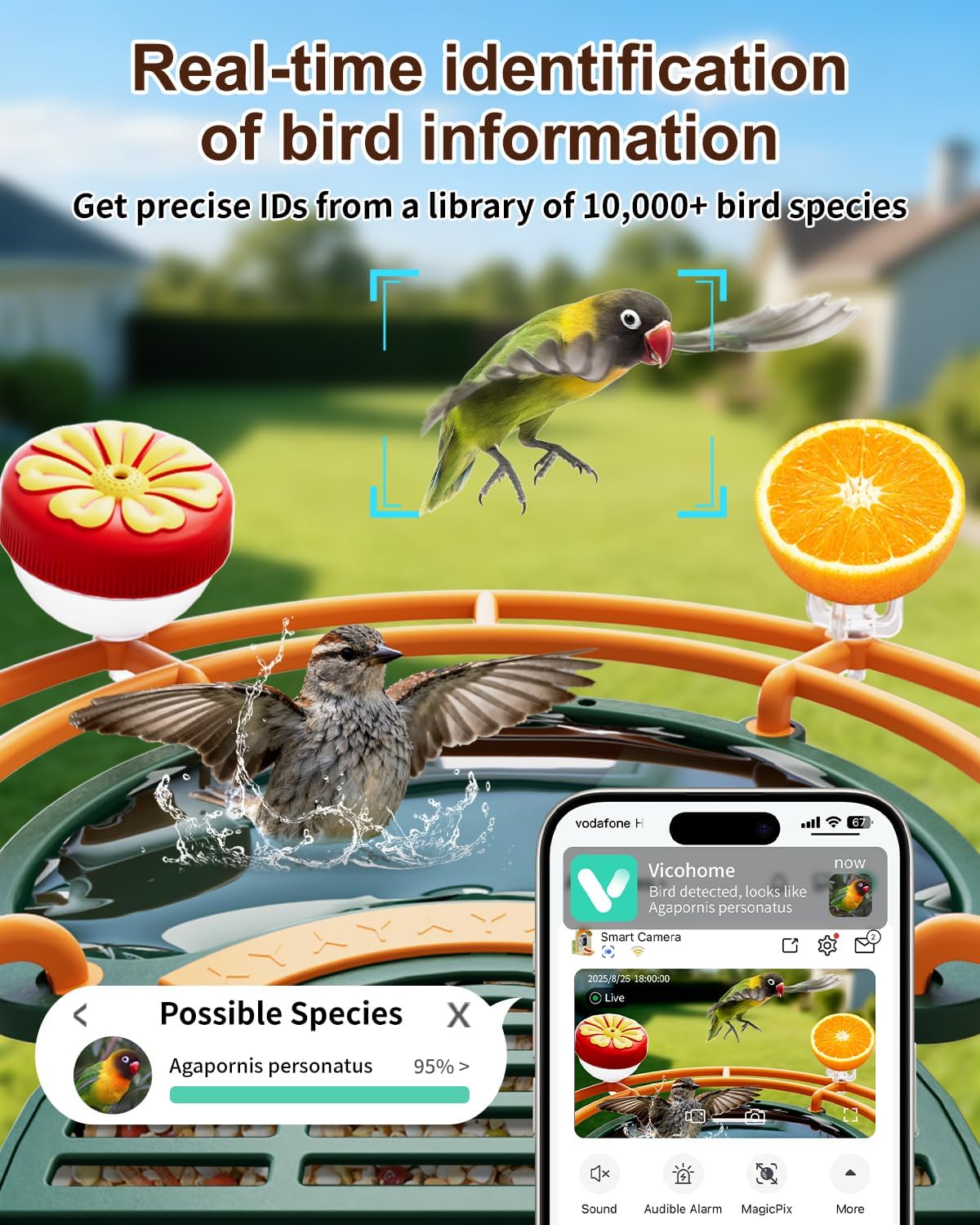 - 【Solar Powered with AI Alerts】Get notified when birds come to feed or bathe! Powered by the sun, this solar bird feeder camera uses AI to identify 10000+ species and send alerts. The built-in battery offers months of worry-free operation.
