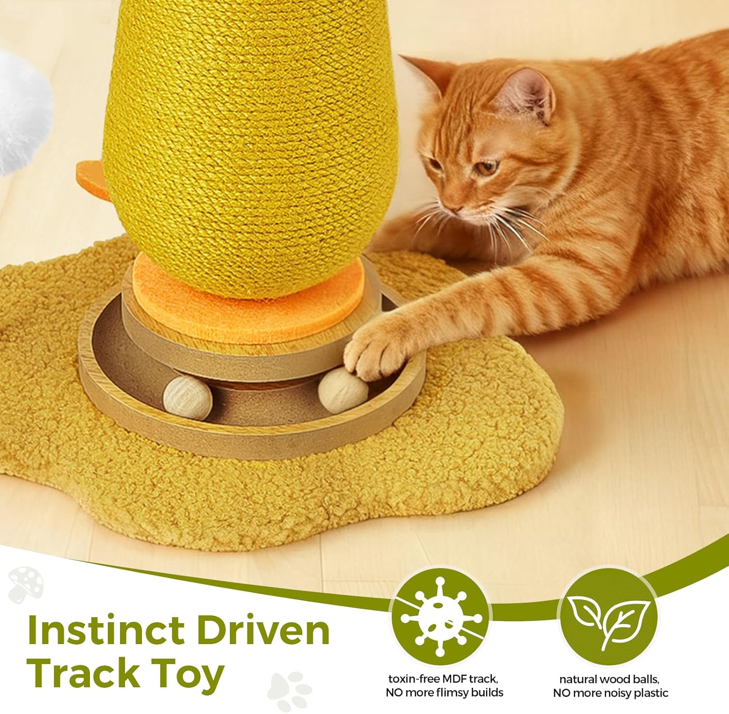 - Cat Scratching Post with Dual Interactive Cat Toys – Ball Track and Spring Ball 2 toys in 1 cat scratching post stimulate cat’s natural hunting instincts through dynamic movement, encouraging prolonged playtime and mental engagement.