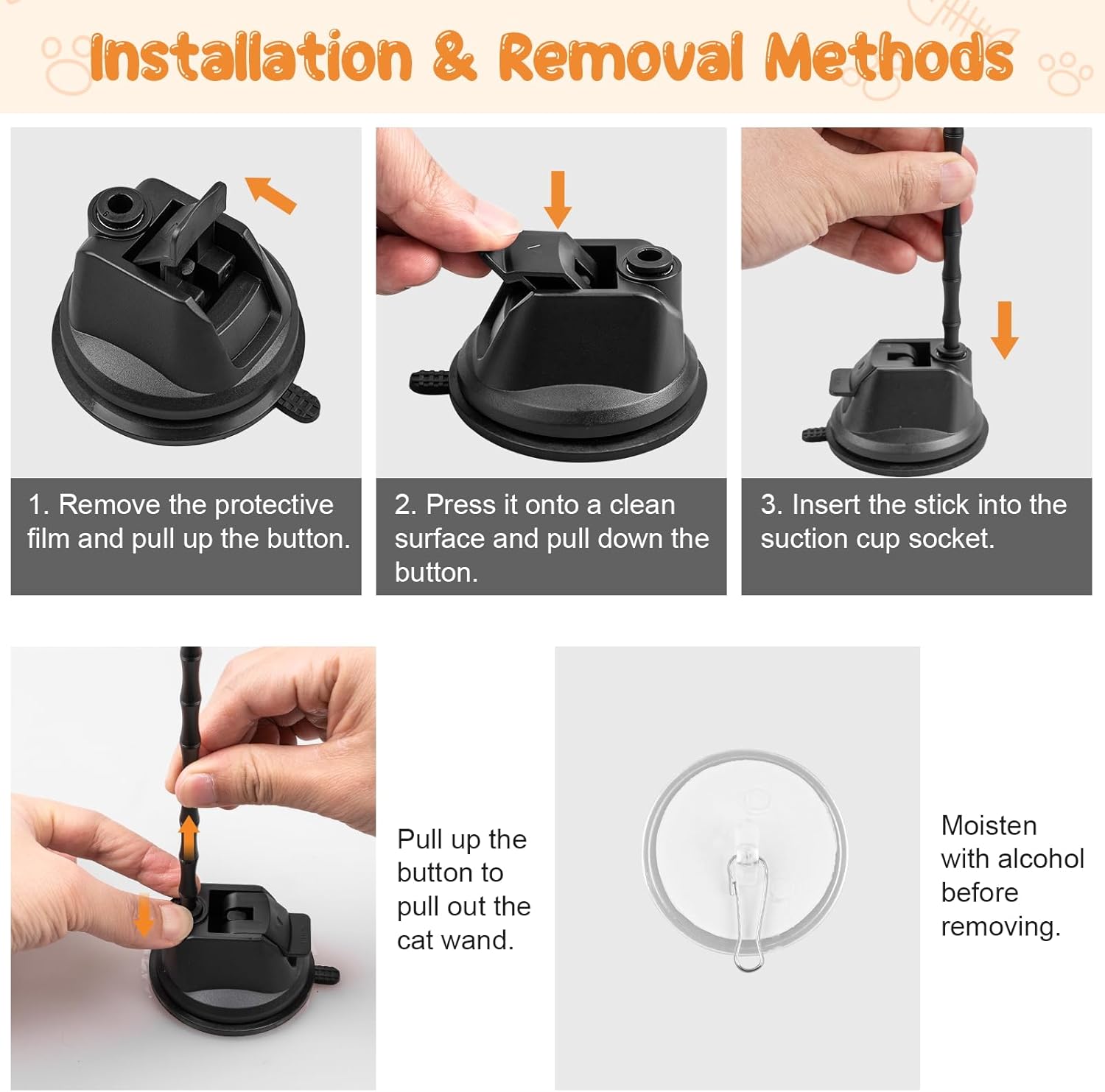 • Quality Materials: Our feather wand cat toys are made of high-elastic steel wire that is not easy to break, and the upgraded powerful suction cups can withstand 22 lbs of tension, so that your beloved cat can play with our cat teaser toy with no worry