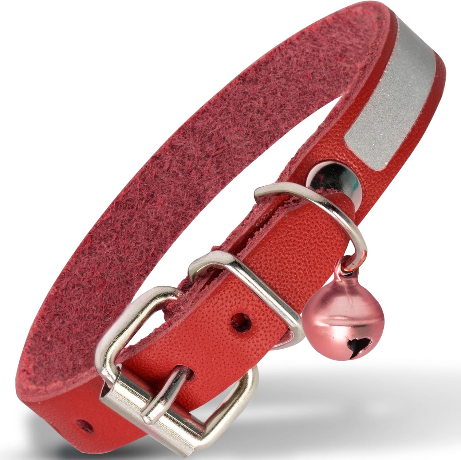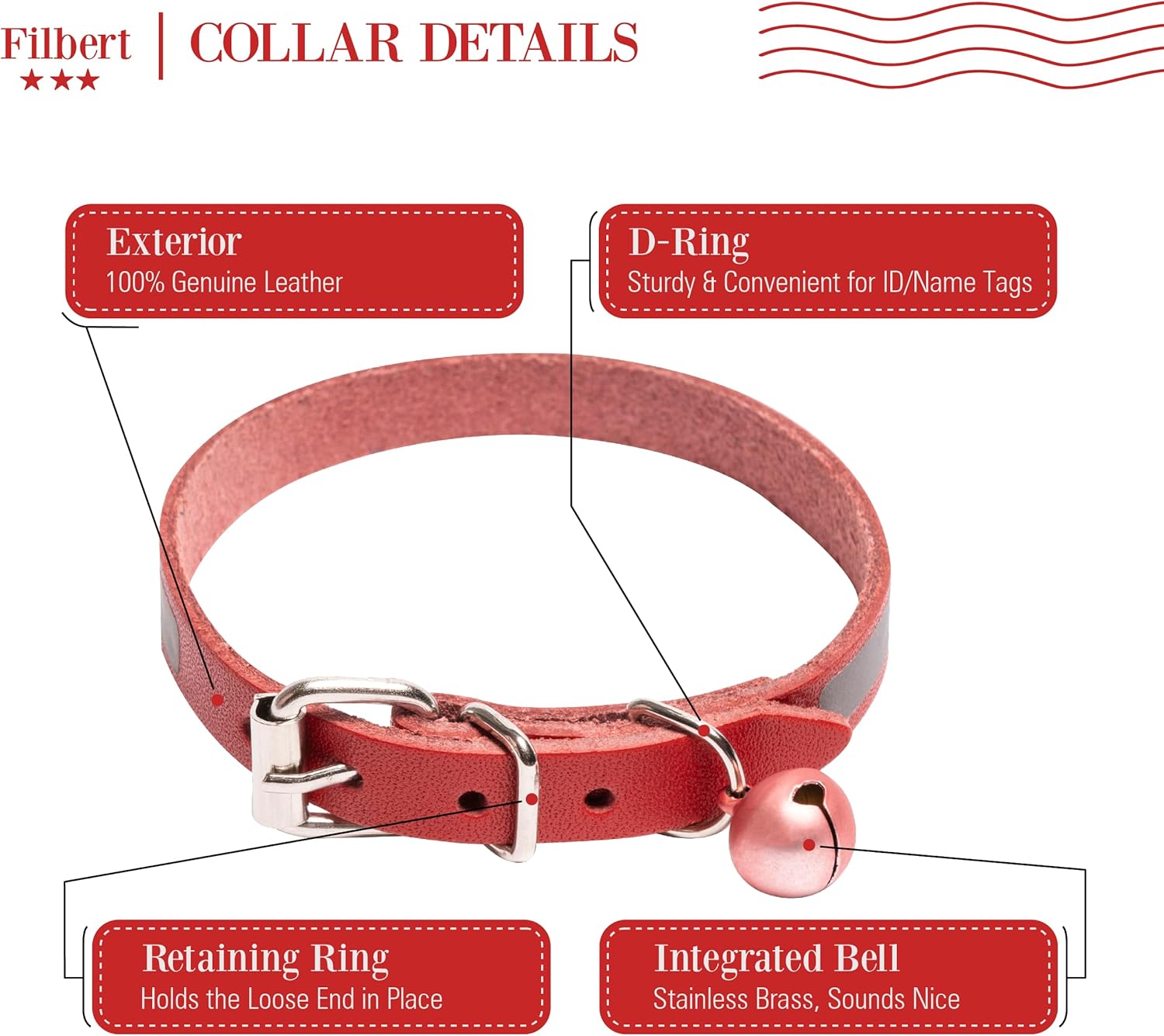 Filbert Leather Cat Collar, Reflective Cat Collar, Leather Accessories with Bell, Bird Warning, Suitable for Indoor and Outdoor, Non Breakaway, Durable, Stylish Design, Red, Medium 7″ – 9″