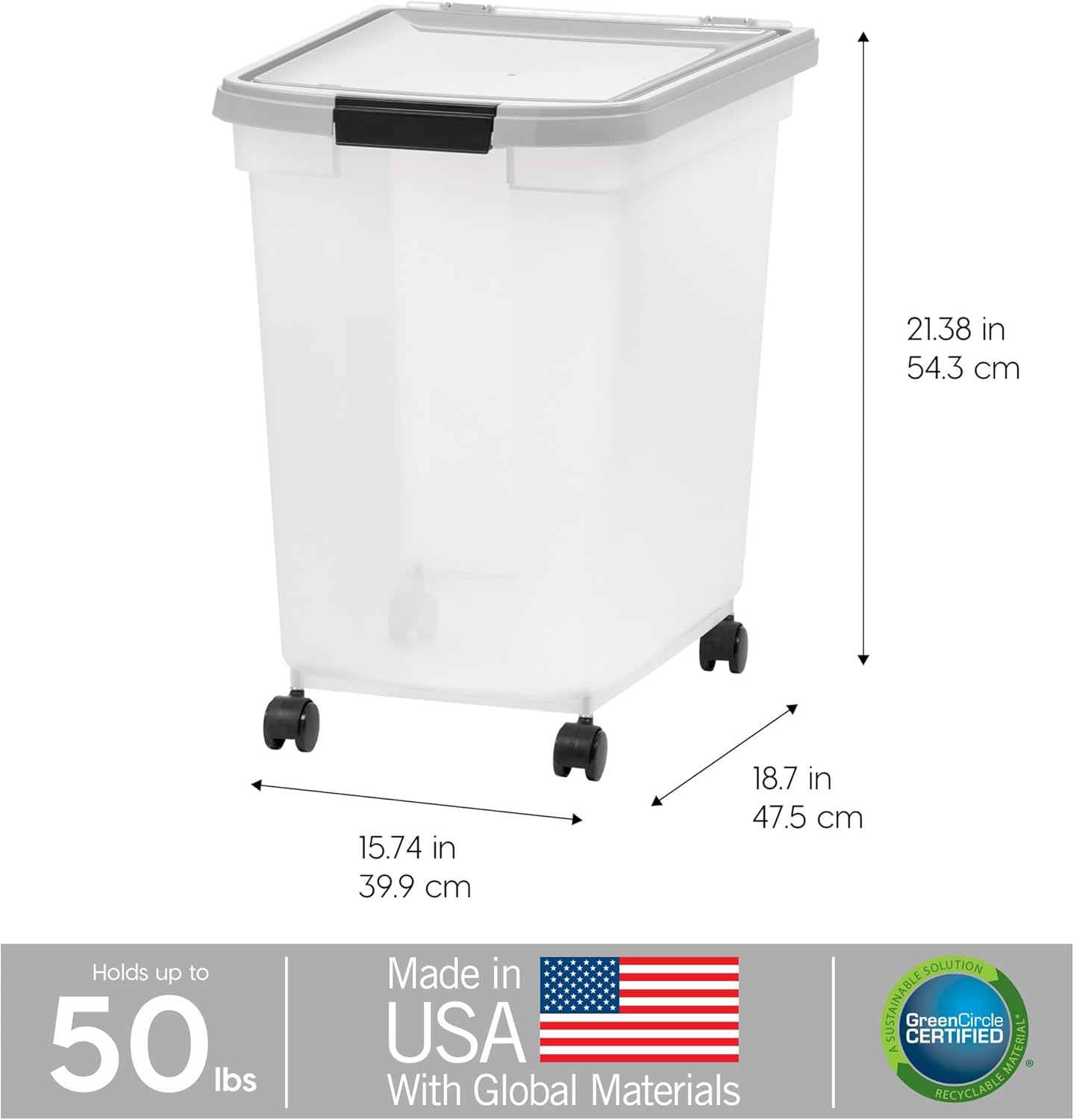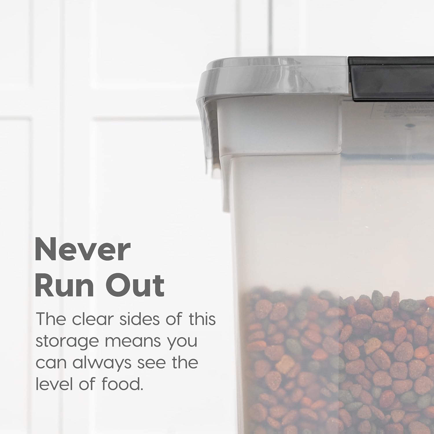 - CLEAR CONTAINER BODY: The translucent body allows you to check the food level in just one glance. Quickly check the remaining amount before you head to the pet store. Designed with a wide top and secure latch for easy opening, scooping and cleaning.