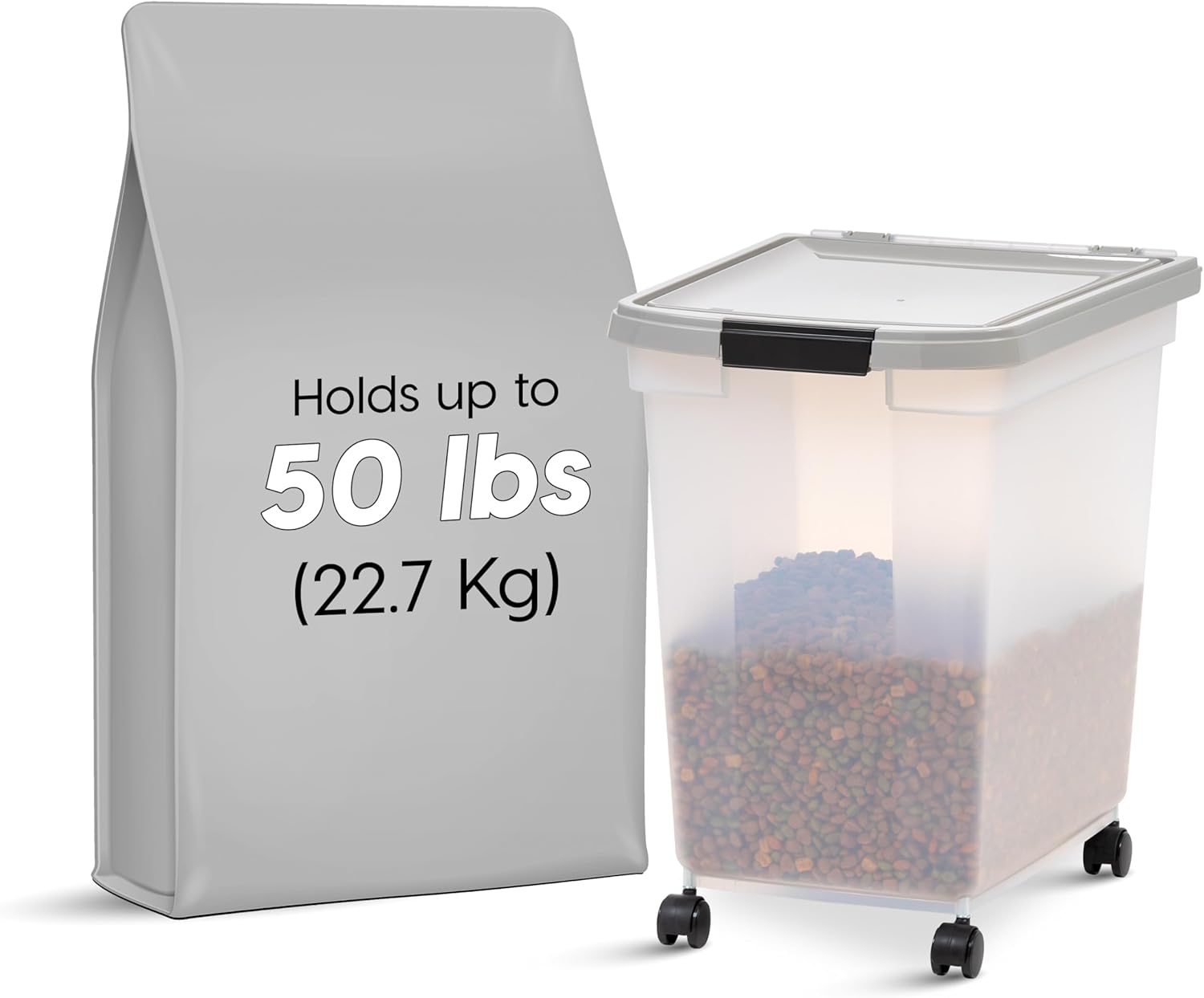 - FOOD FOR ALL: Store your cute family member’s dry foods into sealable and portable pet food container. This airtight food storage container is great for storing 50 Lbs of dry food (the capacity will depend on what kind of pet food you store)