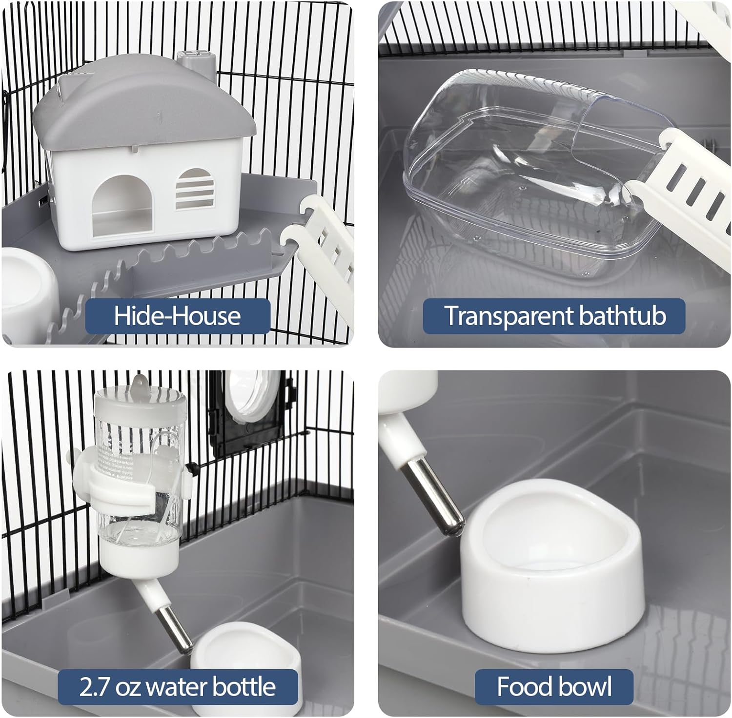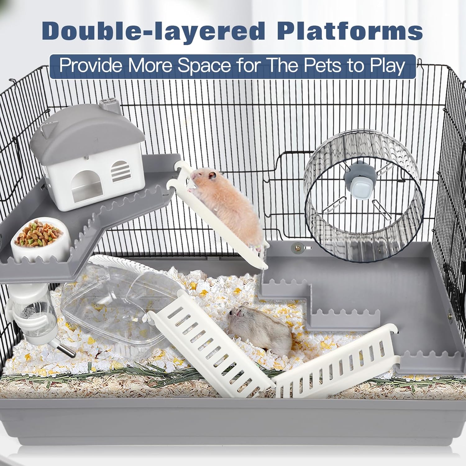 - ACCESSORIES OF THE HAMSTER CAGE KIT: Complete with 2x platforms, 1x semi-transparent exercise running wheel (diameter about 6″), 1x castle house, 3x ladders, 1x bottle with a volume of 80 ml, 1x large transparent bathtub, and 1x snack bowl.