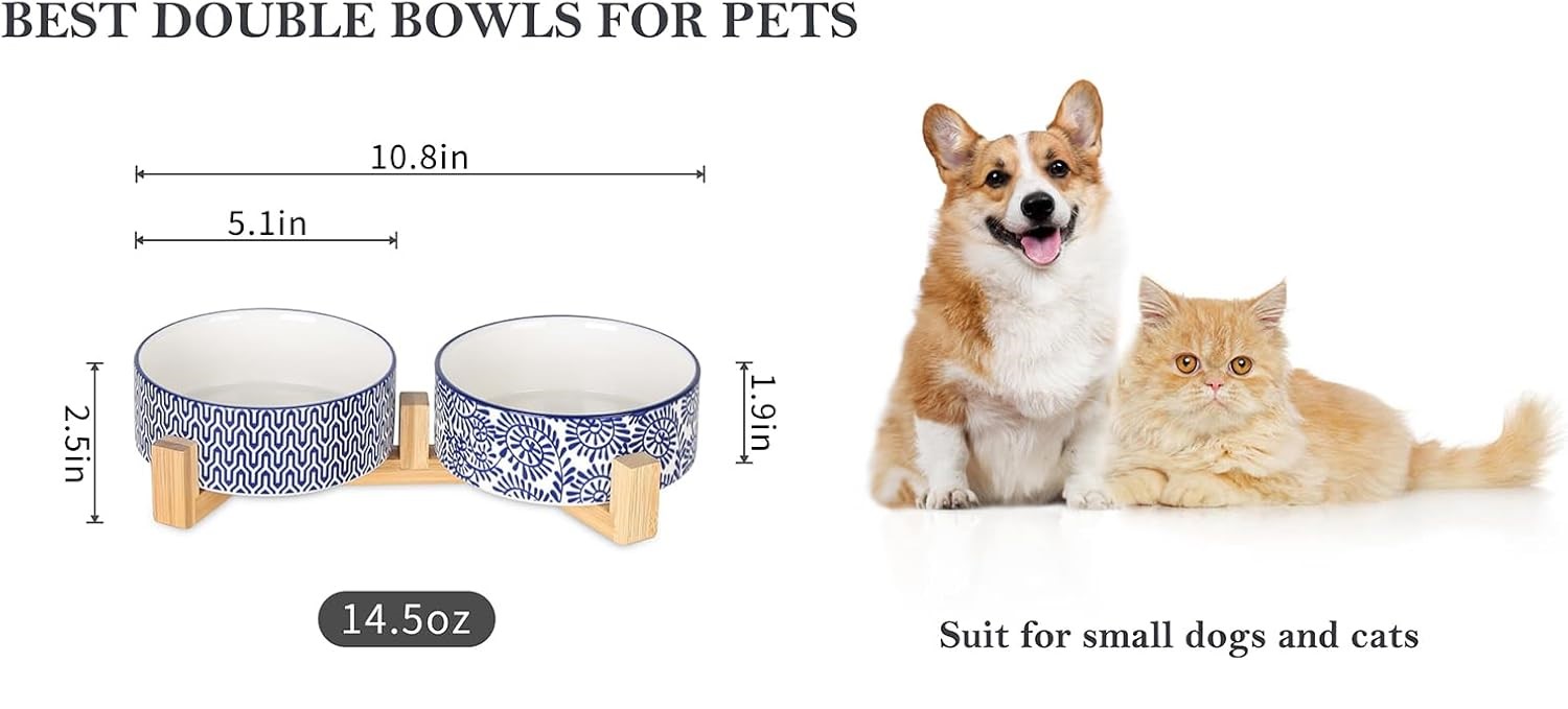 • DOUBLE BOWLS, DELICATE DESIGN – The thoughtful design of these double bowls offers convenience for your pets. You can use one bowl for food and another one for water, raising the dishes closer to your pet for more comfortable eating. Decorated with blue flowers and geometric patterns, these make them more unique that fit perfectly with any home decor style.