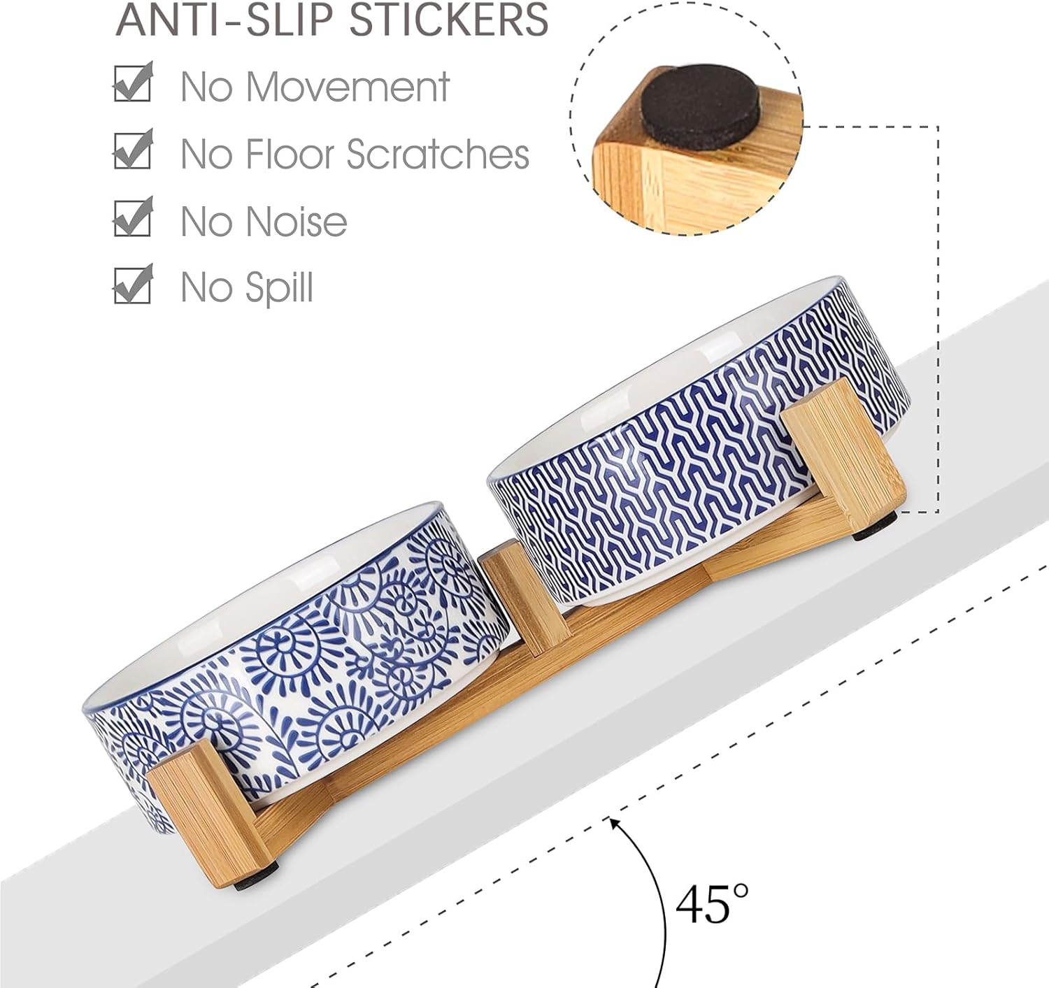 Selamica Ceramic 14 OZ Dog Bowls, Dog Food and Water Bowls with Wooden Stand, Anti-Slip Dog Dishes Set for Cats & Small Dogs, Weighted Pet Bowls Set of 2, Vintage Blue