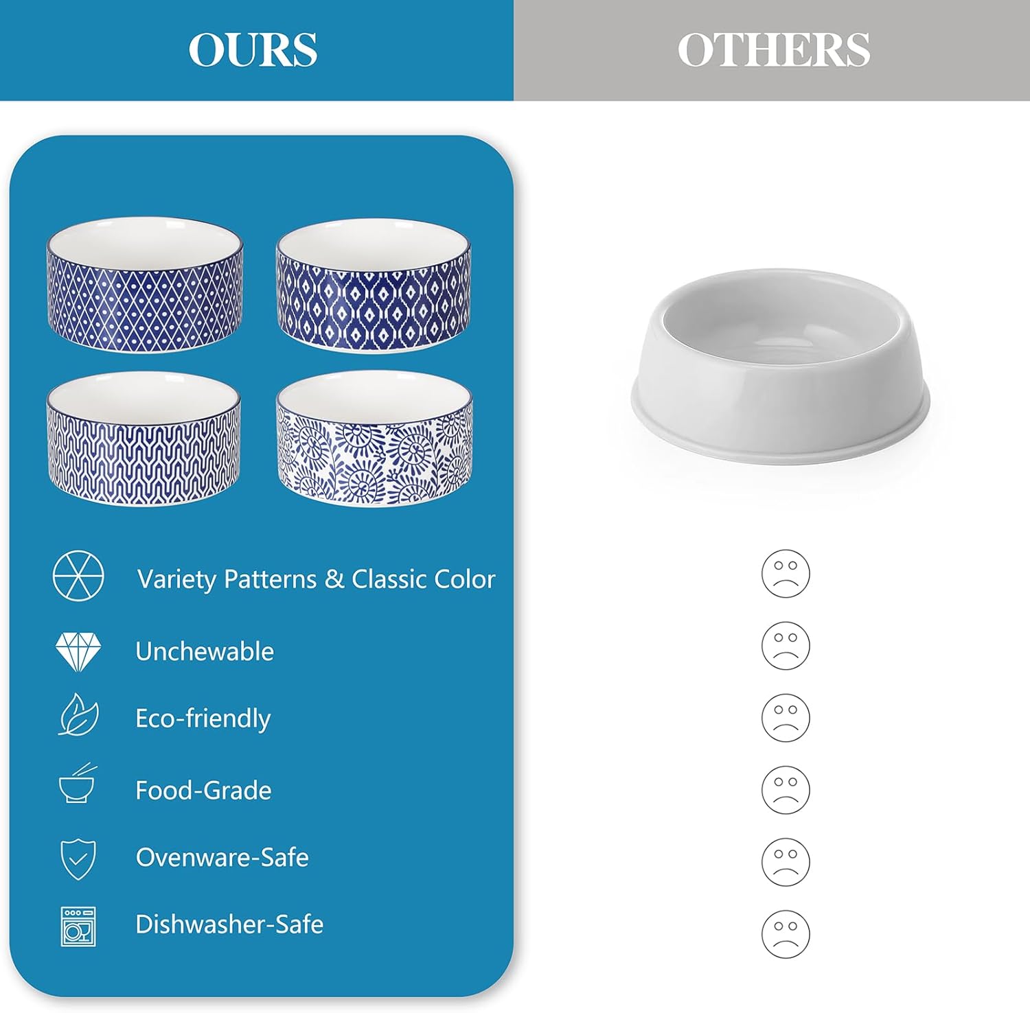 • HEALTHY STURDY CERAMIC MATERIAL – Our dog food dishes are made of premium ceramic material, which has no harmful lead & cadmium, odorless, sturdy, and healthy for your furry friends. And the ceramic pet bowl helps your dog away from chin disease. Its smooth glaze finish makes it wash by hand or dishwasher easily. You can also heat the food in the microwave for your pets at any time.