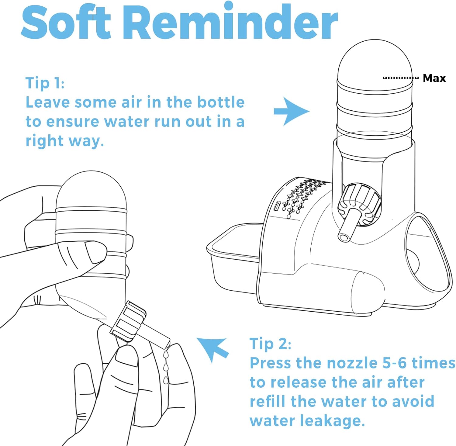 - 【Softer reminder】 ✅ Tip 1: Please don’t add water above the max line and leave some air in the bottle to ensure water run out in a right way. ✅ Tip 2: Please press the nozzle at least 5-6 times before using when you refill the water to release the air to avoid water leakage.✅ Tip 3:Please put the bottle flat against the bottom of the cage, not on the sawdust.