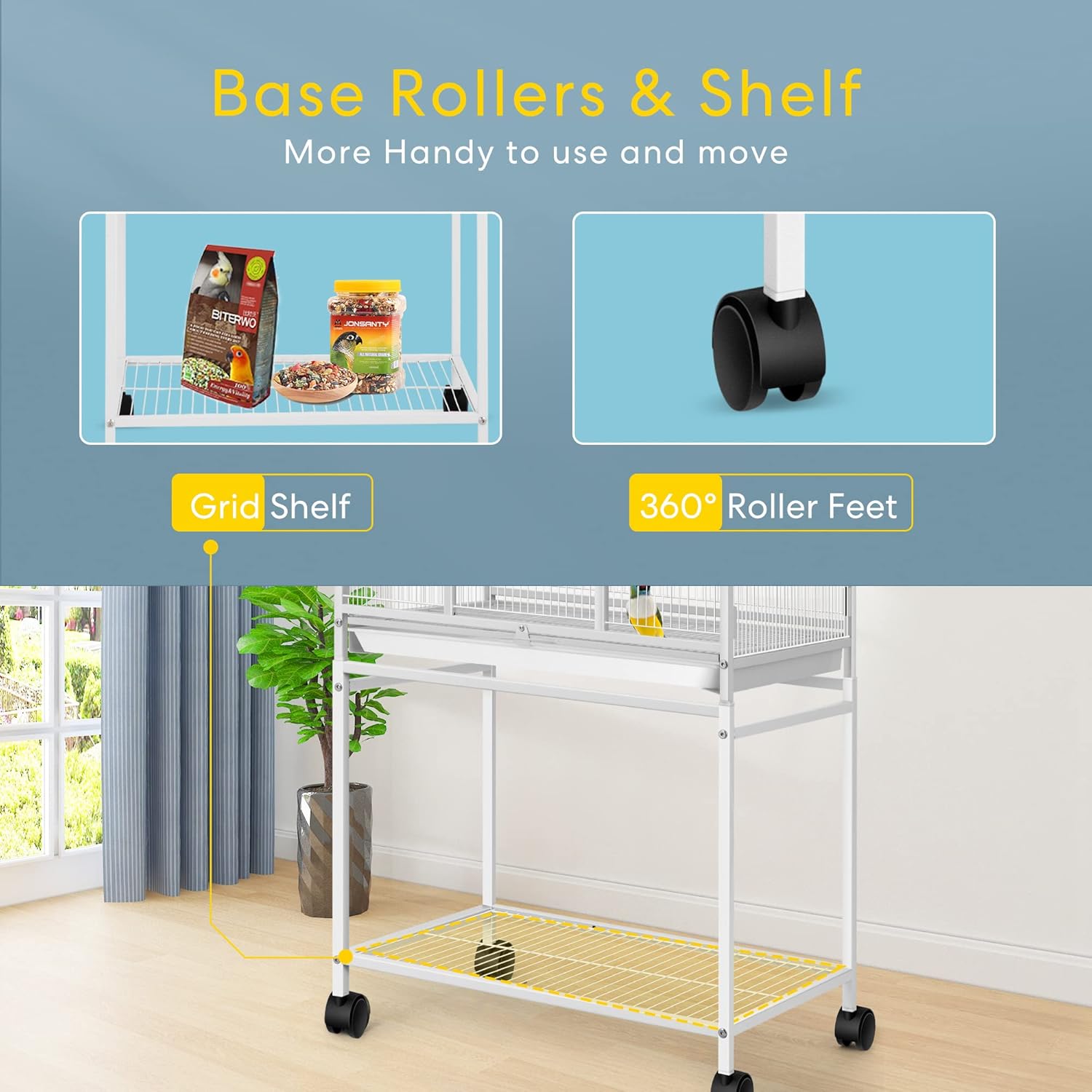 • MULTIPLE FUNCTIONS – The design with a flat top gives you more free space to hang bird toys or put some potted plants to decorate the appearance of your cage, increasing the enjoyment of the bird cage; Different decorations and useful equipment can be hung on either side of the cage or put on the mesh shelf