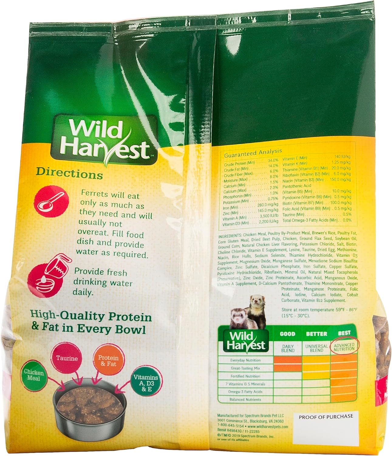 Wild Harvest™ bird and small animal products offer a full assortment of nutrition and interactive engagement products for your daily bird and small animal needs. We’re committed to providing your birds and small pets with a complete diet containing the vitamins, minerals and nutrients they need for a happy, healthy life. Wild Harvest™ Advanced Nutrition Ferret has a balanced variety of nutrients blended specifically for healthy and happy furry family members, with a large variety of high-quality protein and fat in every bowl. This high protein and taurine diet delivers a great flavor that ferrets enjoy. Wild Harvest Advanced Nutrition Ferret provides premium nutrition for developing, maintaining and enjoying optimum health. Ferrets are carnivores and require high-quality animal protein and fat. This specially formulated food ensures that your ferret will receive the protein, fat and vitamins that are needed to support a strong body. This blend creates a tantalizing taste your ferret will love. Ferrets will eat only as much as they need and will not usually overeat. Fill the food dish and provide fresh drinking water daily.