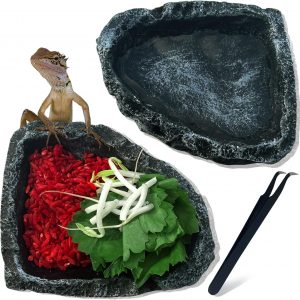 2 Pack Reptile Water Dish – Reptile Water and Food Bowls with Tongs Imitating Natural Rock,Breadworm Feeding for Leopard Gecko Lizard Spider Scorpion Chameleon (2Pcs Square Type)