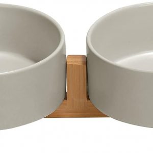 SPUNKYJUNKY Ceramic Dog and Cat Bowl with Wood Stand Non-Slip Matte Glaze Weighted Food Water Set for Cats & Small Dogs 13.5OZ