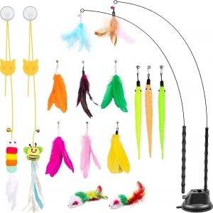 Depets Cat Wand Toy, 15 Pcs Interactive Cat Feather Toys for Indoor Self Play & Exercise, 2 Play Modes Kitten Teaser Wand, Reusable Suction Cup Kitten Toys